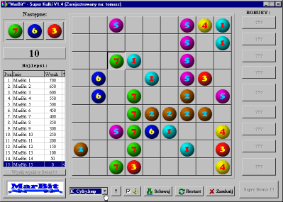 On the left of the grid is a high game score, you end a game by hitting restart. One thing that makes this game different, is the row of bonus buttons on the right of the grid. When you hit these buttons, they seemed to change the colors of the next 3 balls coming up, which I expected from the second button [which said different colors] but it also seemed to happen from the first button, which just said bonus. Directions would be nice, but you can stumble through without them.